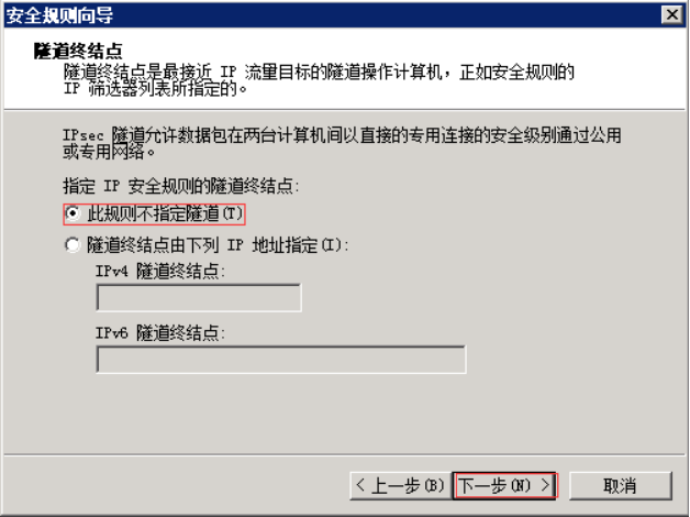 4、在“隧道終結(jié)點(diǎn)”頁面選擇“此規(guī)則不指定隧道(T)”, 點(diǎn)擊“下一步(N)>”(圖24)