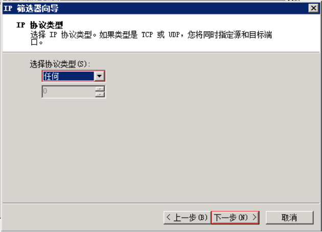 5、這時(shí)到了選擇IP協(xié)議類型頁面,由于是阻止所有訪問,故在“選擇協(xié)議類型(S):”選擇“任何”(圖8),再次點(diǎn)擊“下一步(N)>”,到達(dá)“完成”頁面(圖9、圖10)