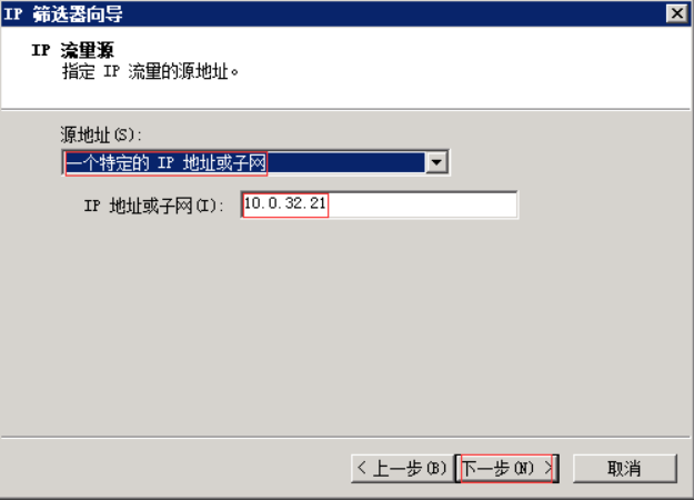 3、這時(shí)到了“IP流量源”頁面,在“源地址(S):”選擇“一個(gè)特定的IP地址或子網(wǎng)”,將需要阻止的IP加進(jìn)去(這里設(shè)置阻止的IP為10.0.32.21)。然后繼續(xù)點(diǎn)擊“下一步(N)>”(圖6)