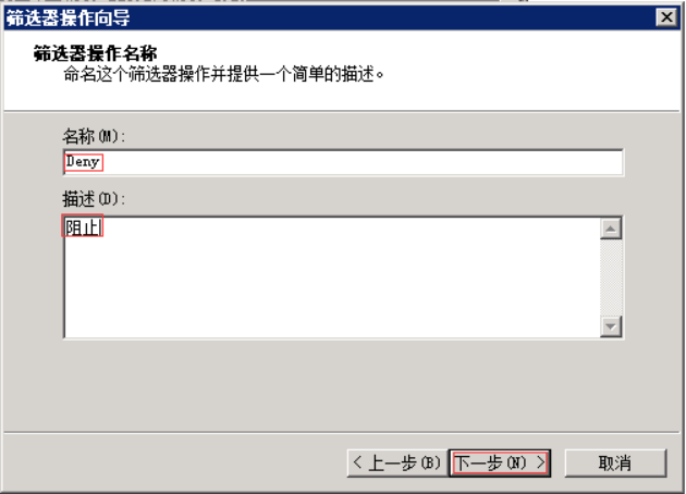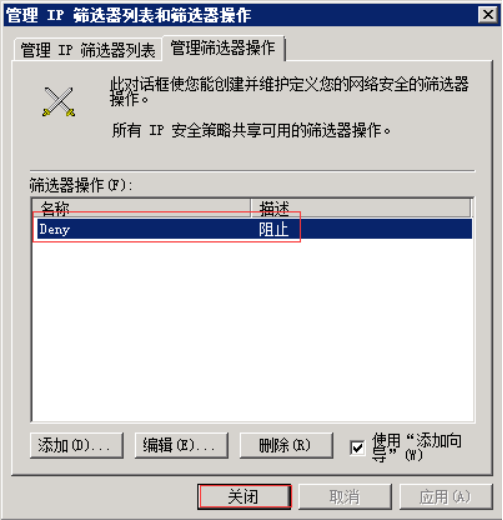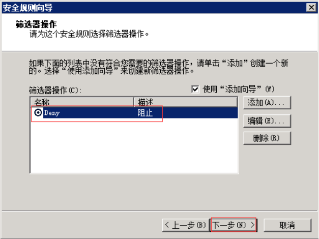 7、在“篩選器操作”頁面選擇之前創(chuàng)建的“Deny”篩選器,然后點(diǎn)擊“下一步(N)>”,直至完成(圖27、28)