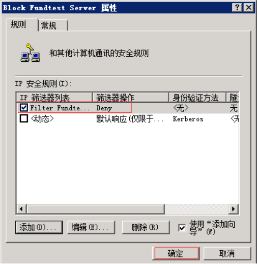 8、最后在該IP安全控制策略屬性頁面“規(guī)則”-“IP安全規(guī)則”中選中上面設(shè)置的規(guī)則(圖29),然后“確定”完成。