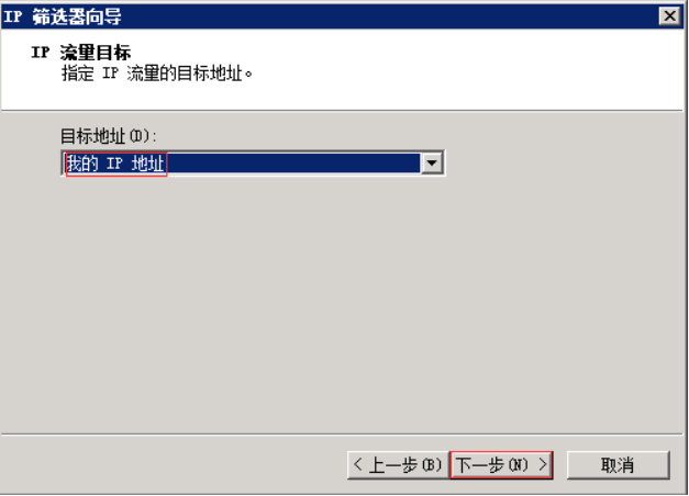 4、接下來指定目標(biāo)地址,在“目標(biāo)地址(D):”選擇“我的IP地址”,然后繼續(xù)點(diǎn)擊“下一步(N)>”(圖7)