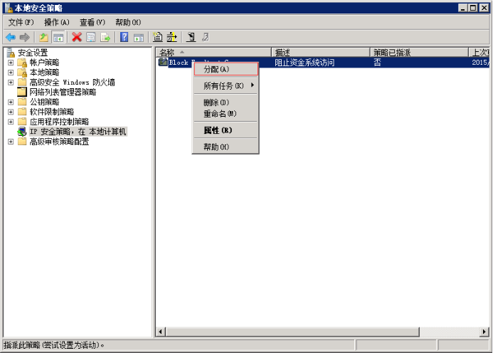 在“本地安全策略”頁面,右鍵點(diǎn)擊上面創(chuàng)建完成的IP控制策略,選擇“分配(A)”。(圖30)