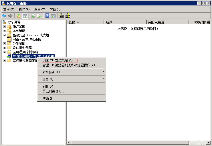 1、如圖17,在“本地安全策略”頁面,右鍵點(diǎn)擊“IP安全策略,在本地計(jì)算機(jī)”,選擇“創(chuàng)建IP安全策略(C)…”,開始創(chuàng)建IP安全策略。(圖17、18)