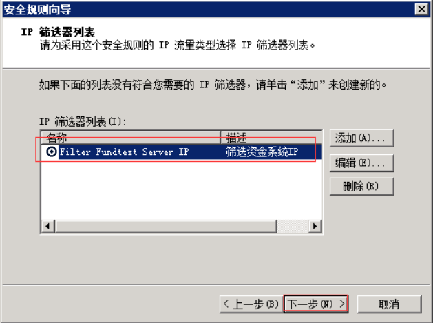 6、這時(shí)到了IP篩選列表選擇頁面,選擇之前創(chuàng)建的名稱為“Filter Fundtest Server IP”的IP篩選器,然后點(diǎn)擊“下一步(N)>”(圖26)