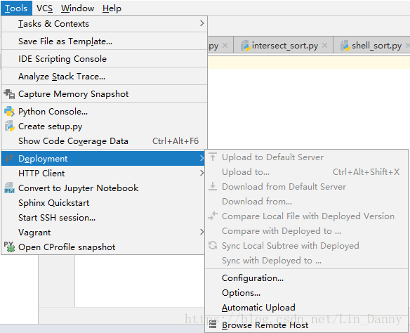 Pycharm菜單欄,如下圖所示,依次點擊 Tools -> Deployment -> Configration…