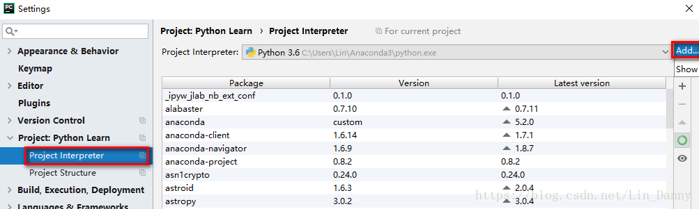 在菜單欄,File -> Settings… -> Project ×× -> Project Interpreter,點擊右側 Add按鈕,添加解釋器。