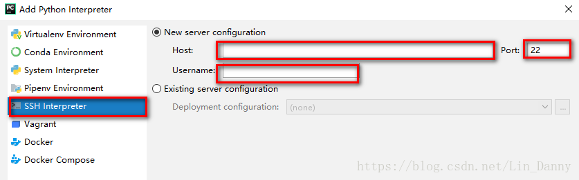 選擇SSH Interpreter,填寫服務器的 Host 地址,端口Port,用戶名Username,填好后,下一步Next。