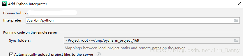 選擇遠程服務器上Python解釋器的位置,服務器上的遠程同步文件夾Sync folders,可以選擇多個。如果不知道Python安裝在哪,可以遠程連接服務器后,使用 命令 which python 找到Python安裝位置。