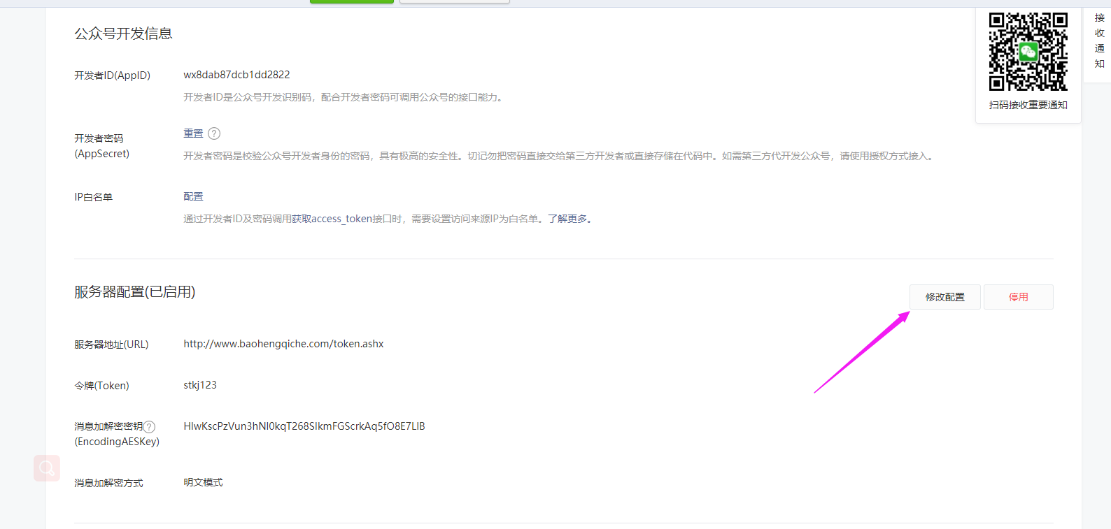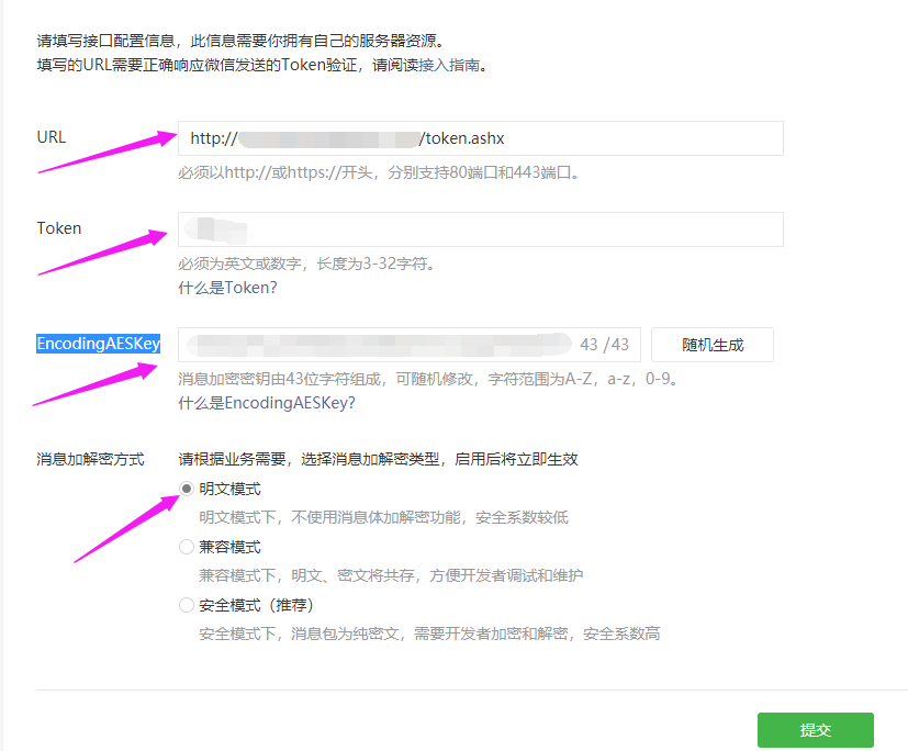 Token:自主設置,這個token與公眾平臺wiki中常提的access_token不是一回事。這個token只用于驗證開發者服務器。(注:Token可以隨便寫 寫完記住留著備用)