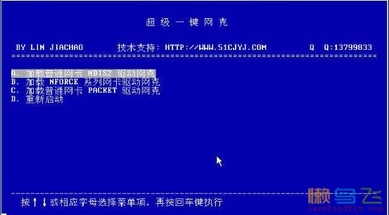 按字母鍵或按方向鍵選擇加載網卡驅動,如果你不確定哪個驅動的話可以多試兩次,如果網卡驅動加載不正確的話,有時候也可以進行網克,但速度肯定會很慢。選擇好網卡驅動后進入網克界面。