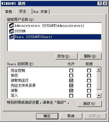 Windows目錄要加上給users的默認權限,否則ASP和ASPX等應用程序就無法運行。以前有朋友單獨設置Instsrv和temp等目錄權限,其實沒有這個必要的。