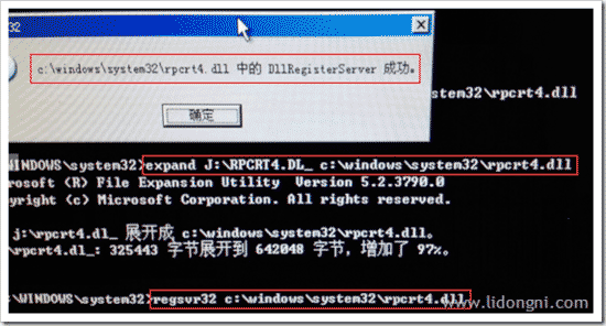 expand j:/i386/RPCRT4.DL_ c:/windows/system32/rpcrt4.dll (注意備份原有rpcrt4.dll文件,以防不時之需);