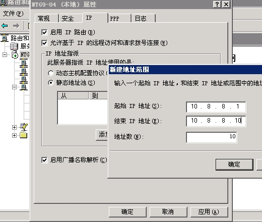 點擊“是”,開始服務,啟動VPN服務后,“路由和遠程訪問”的界面下面開始配置VPN服務器,在服務器上點擊右鍵,選擇“屬性”,在彈出的窗口中選擇“IP”標簽,在“IP地址指派”中選擇“靜態地址池”。