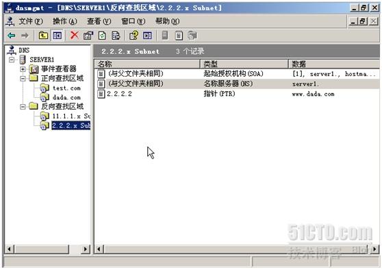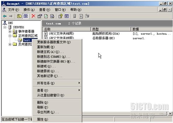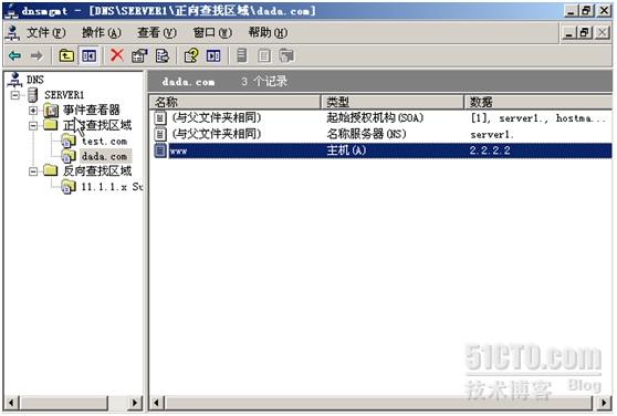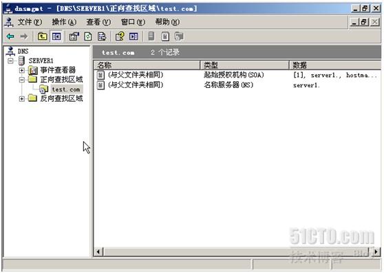 1、完成“DNS服務(wù)器的配置”后,在DNS控制臺的正向查找區(qū)域可以看到下圖畫面。