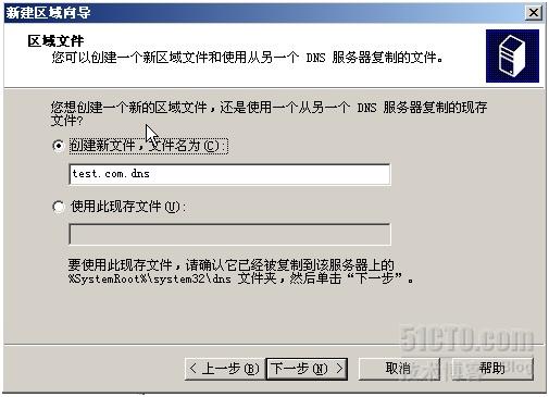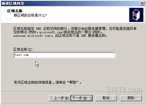 6、填入?yún)^(qū)域名稱 (如果網(wǎng)絡(luò)中的服務(wù)器要使用的完整域名是“ www.test.com”,則在區(qū)域名稱中填入“test.com”)