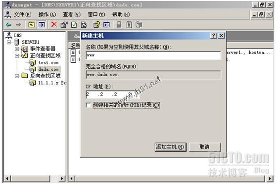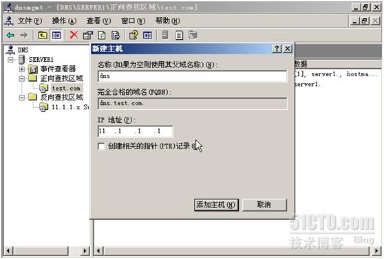 3、創(chuàng)建完整域名為“dns.test.com”的主機(jī)記錄。在下個畫面填入主機(jī)名“dns”,IP地址為“11.1.1.1”。同時(shí)你也可以勾上復(fù)選框“創(chuàng)建相關(guān)的指針(PTR)記錄”,本實(shí)驗(yàn)在此不勾上,在下個圖中會示例手動添加。