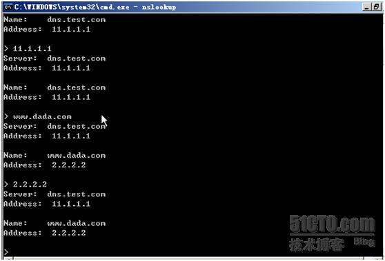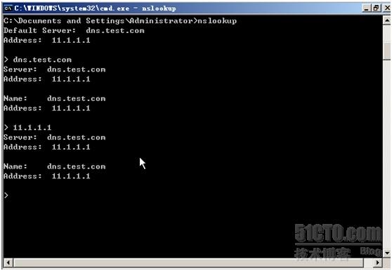 7、測試。在命令提示符中,依次鍵入nslookup,測試域名:dns.test.com和IP:11.1.1.1都出現(xiàn)相應(yīng)的解析畫面,如下圖,則dns服務(wù)器解析成功。