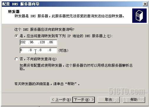 14、在彈出的窗口中設(shè)置NDS的轉(zhuǎn)發(fā)器,在轉(zhuǎn)發(fā)器中輸入“202.96.128.86”和“8.8.8.8”(在該DNS服務(wù)器中無法解析的域名,該DNS服務(wù)器可以轉(zhuǎn)發(fā)給其他指定的DNS服務(wù)器上進(jìn)行解析,如向ISP(互聯(lián)網(wǎng)服務(wù)提供商)的DNS服務(wù)器轉(zhuǎn)發(fā))