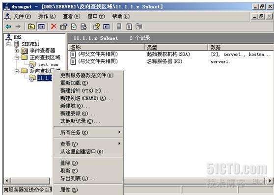 4、在【反向查找區(qū)域】中的【11.1.1.x Subnet】中右鍵,選擇【新建指針(PTR)】