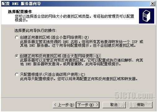3、選擇【創(chuàng)建正向和反向查找區(qū)域(適合大型網(wǎng)絡(luò)使用)】-----【下一步】