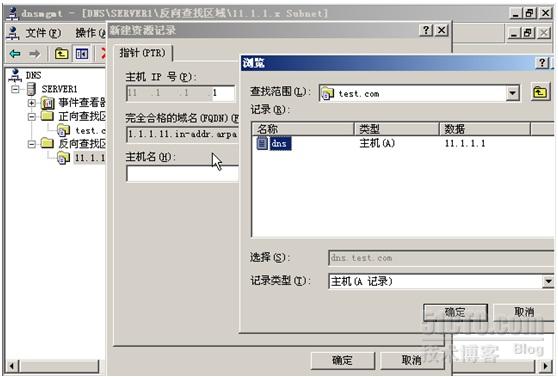 5、填入主機(jī)IP號11.1.1.1,再在瀏覽中找到test.com里面的主機(jī)名為dns的記錄,選擇它并確定。