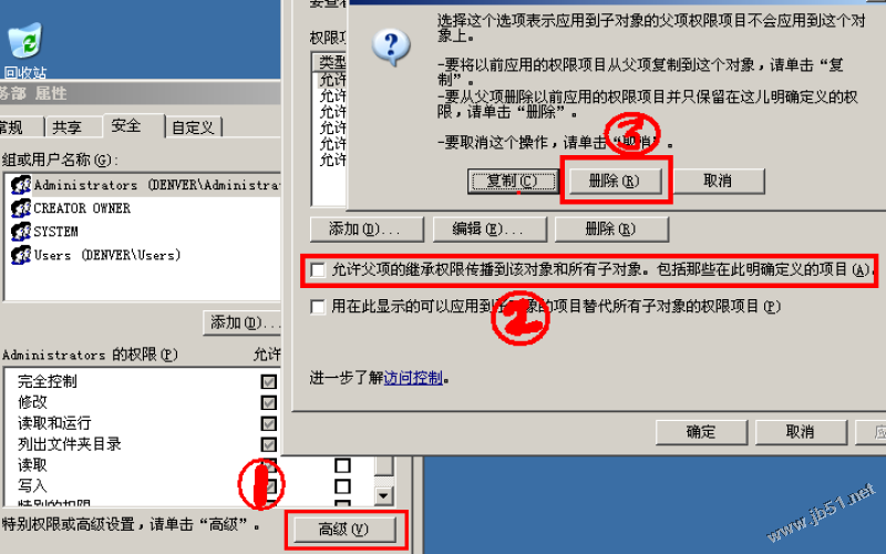 ★ 取消各級文件夾的繼承權限,以防止公司各個部門的員工互相訪問,避免公司機密外泄。并且相應的文件夾只有相應的部門職員可以進入。(去掉 “允許父項的繼承權限傳播到該對象的子對象”前面的“勾” )
