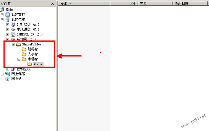 (3)文件服務器H卷上共享文件夾ShareFolder,里面有三個文件夾:市場部,財務部,人事部.Alice是屬于市場部的,所以在市場部的文件夾里面有一個文件夾Alice,此文件夾方便Alice存儲數據,要求公司內部所有的人只能訪問自己的文件夾,而且也只能訪問自己的文件夾。