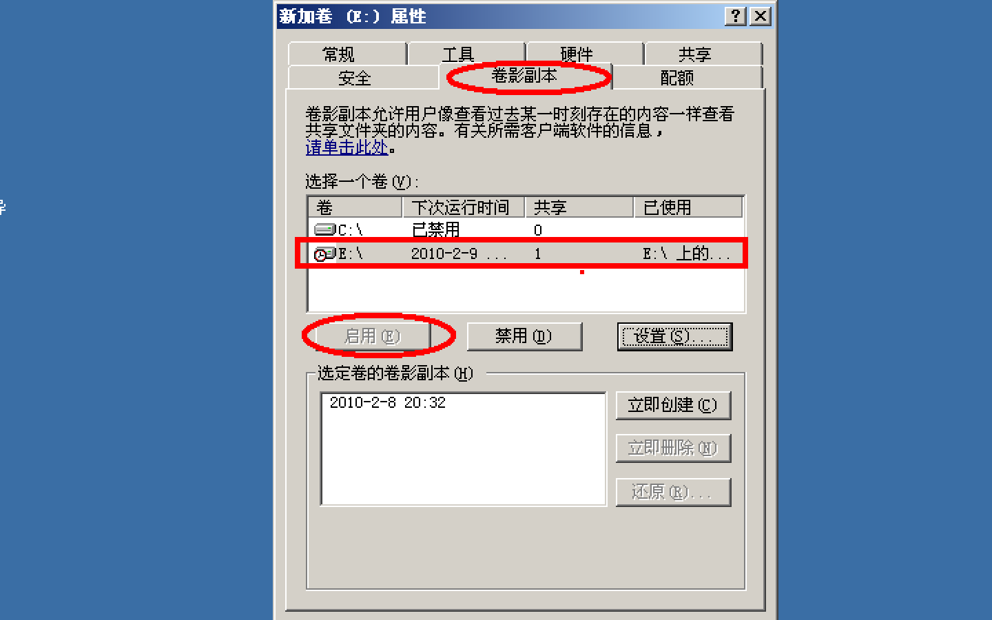 右鍵 ShareFolder文件夾所在的卷->卷影副本->啟用