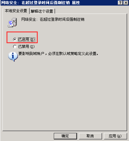 2、“網(wǎng)絡(luò)安全:在超過登錄時間后強(qiáng)制注銷” 默認(rèn)為:已禁用 修改為 已啟用。
