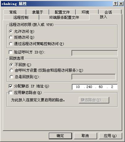 先新建一個叫“chnking”的用戶,創建好后,查看這個用戶的屬性,在“撥入”標簽中做相應的設置,如圖: