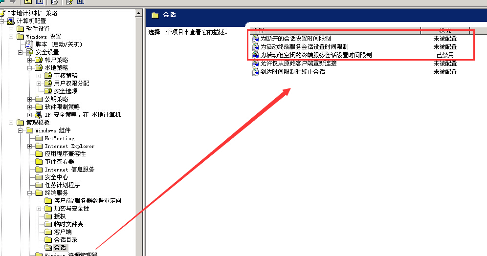 開始-->運行-->gpedit.msc 計算機配置->管理模板->Windows組件->終端服務->會話 把"為斷開的會話設置時間限制"改為"未被配置"。