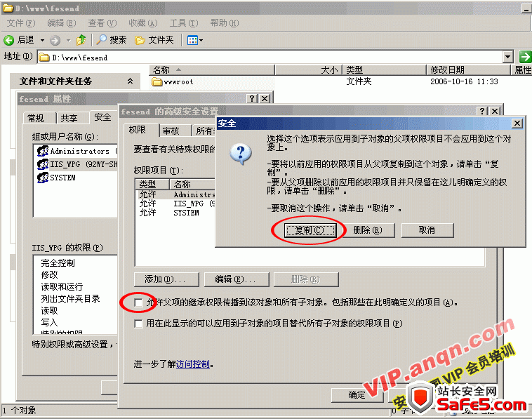 ?、?設(shè)定 fesend 用戶站點(diǎn)根目錄的安全權(quán)限,此示例的站點(diǎn)目錄為“D:/www/fesend”,此目錄用于存放 fesend 用戶的站點(diǎn)數(shù)據(jù);