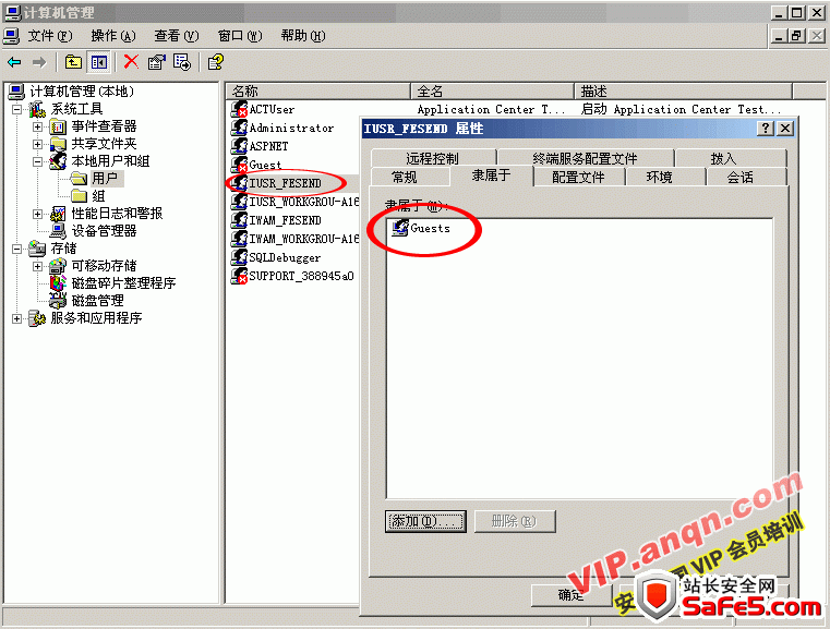 設(shè)置“IUSR_FESEND”帳號(hào)為“Guests”組,刪除“Users”組