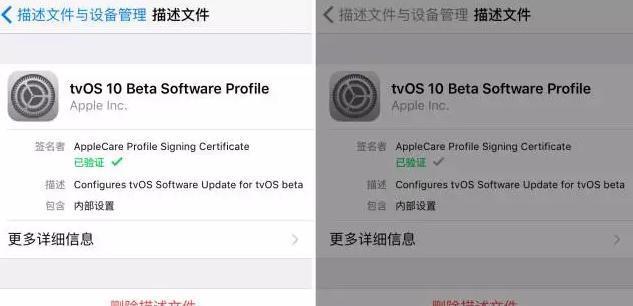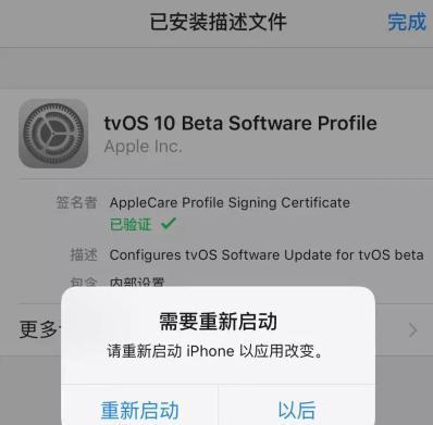 復制鏈接在Safari中打開,會跳轉到提示安裝描述文件,“tvOS 10 Beta Software Profile”,點擊右上角“安裝”
