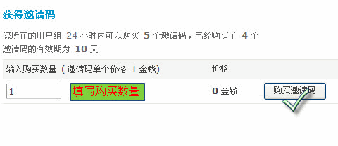 當用戶要獲取邀請碼時,到“獲得邀請碼”下的文本框中輸入購買邀請碼的數量,然后點擊“購買邀請碼”按鈕。如下圖所示: