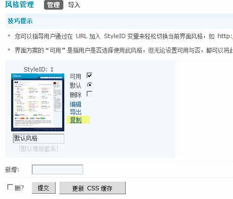 您可以對已有的風格進行可用、默認、刪除等操作,也可以在新增的框內(nèi)輸入自己要新建的風格名,然后提交建立一個新風格。