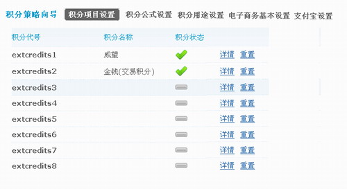 在這個頁面可以查看到擴展積分的啟用情況,還可以在詳情里具體設置沒個擴展積分,可以通過重置的功能把所有用戶的相應擴展積分設置為 0 。