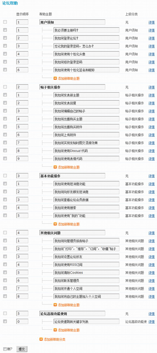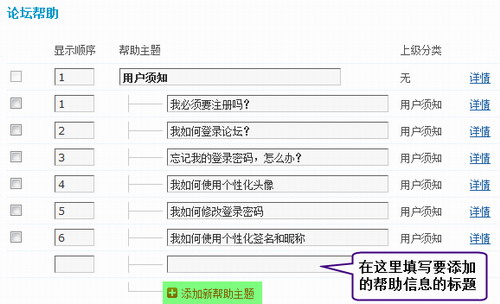 首先選擇要在哪個分類下添加幫助主題,然后點擊該分類下發的“添加新幫助主題”,在彈出的輸入框內填寫要添加的幫助信息的標題和其顯示順序并“提交”。