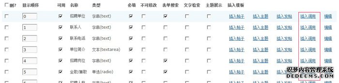 找到你想要在DIY頁面顯示的字段,比如:招聘企業,招聘崗位,招聘人數,在字段后面點擊“插入調用”;