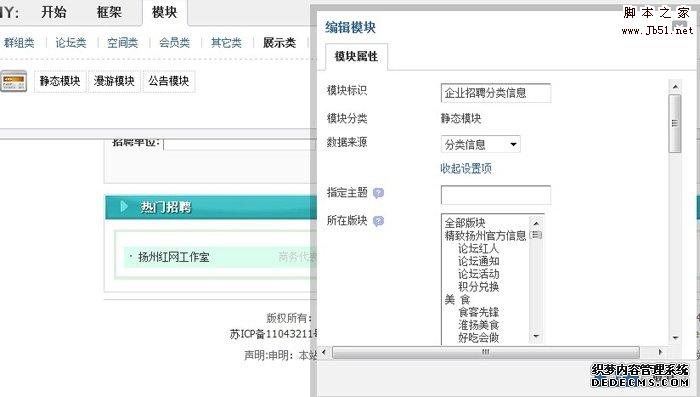 第四步,進入前臺的DIY控制面板中,切換到高級模式,插入模塊選擇:展示類-靜態模塊,選擇分類信息所在的版塊,選擇分類信息,其他的設置可以按照你的實際要求而定。