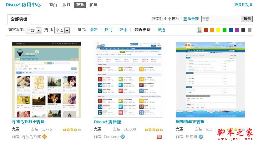 目前Discuz! 應用中心支持的應用類型有插件、模板與擴展。輸入相應的關鍵詞“清新”后共搜索到4個模板供站長選擇。需要特別說明的是,Discuz! 清新版這塊模板是官方出品并且很受歡迎,安裝次數(shù)已經(jīng)突破了16000次。