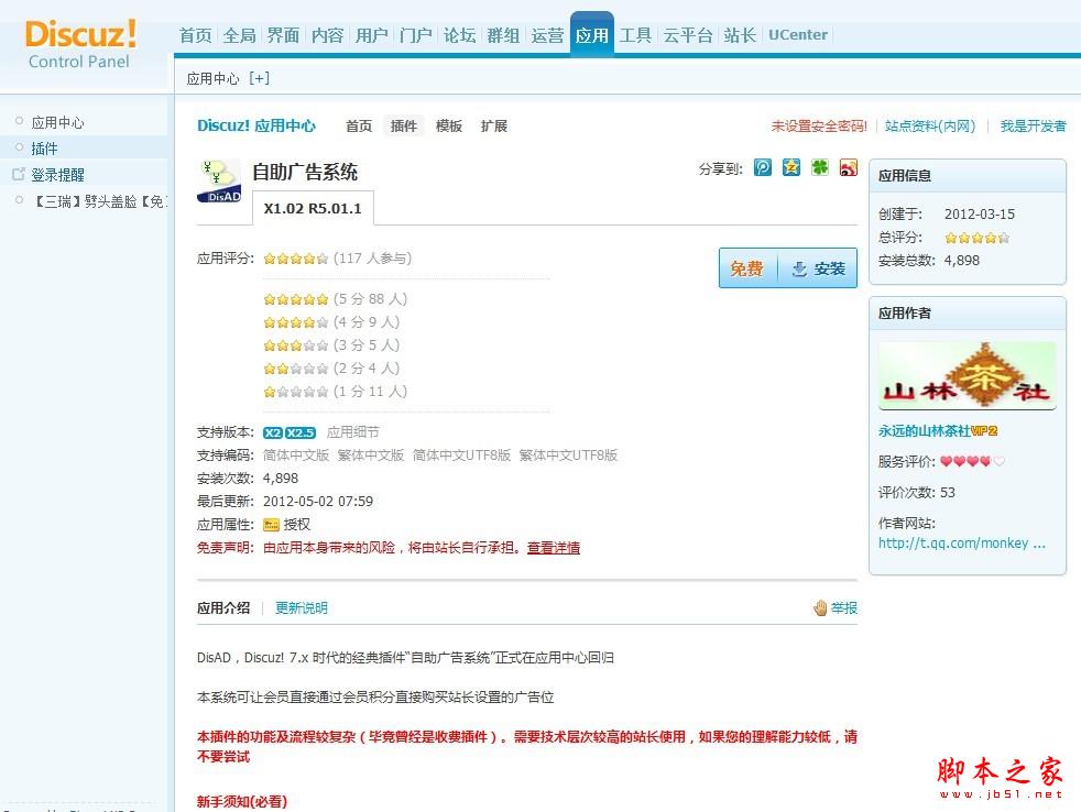 站長找到適合的應用后,下一步就是安裝了。Discuz! 應用中心支持一鍵安裝與卸載,傻瓜式操作大大降低了站長的技術門檻。進入任何一款應用的詳情頁即可點擊安裝應用。例如,進入一款“自助廣告系統(tǒng)”插件,可以看到醒目的安裝按鈕以及相關屬性。