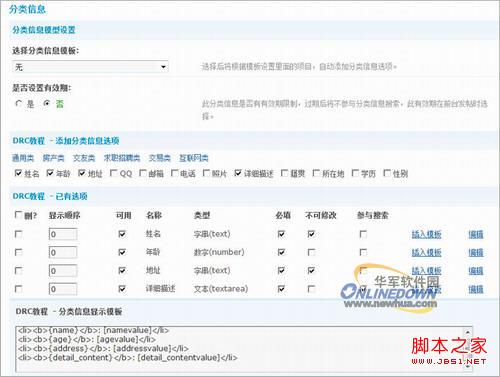 仔細(xì)看上圖,“選擇分類信息模板”這里可以選擇系統(tǒng)預(yù)設(shè)的幾種模型,如:房屋交易信息、車票交易信息、興趣交友信息、公司招聘信息等,如果預(yù)設(shè)這幾種模型不能滿足您的需求,可以往下看,自定義分類信息。在添加分類信息選項欄目中可以勾選您要添加到該分類信息中的選項,勾選后自動出現(xiàn)在“已有選項”欄目中,在“已有選項”欄目中可以對這些選項進(jìn)行設(shè)置,如:是否必填、參與搜索等。需要注意的是,右邊的“插入模板”,可以點擊一下會看到,點擊“插入模板”,會自動將該條選項插入到分類信息模版中,其中,例如name,用化括弧括起來的就是該分類信息選項的名稱,即:姓名,[namevalue]用方括弧括起來的就是該選項的值,即用戶發(fā)帖時候填寫的內(nèi)容。當(dāng)然,默認(rèn)插入的模板是列表的形式,如果自己不滿意默認(rèn)的樣式,可以自定義模板樣式,該處模板支持HTML,想要分類信息在帖子里顯示的更加漂亮,就自己寫模板代碼吧。