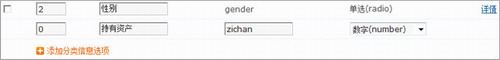 另外,如果上面分類信息選項中,沒有您想增加的選項,您也可以新增一個自定義的選項,比如,要添加一個“持有資產(chǎn)”選項,后臺路徑:后臺 -- 版塊 --分類信息選項,你可以看到現(xiàn)在已存在的選項列表,最下面有一個“添加分類信息選項”,點擊即可新增一個分類信息選項:(如下圖所示)