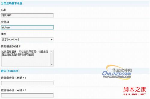 上圖中,該選項的顯示順序、選項名稱、該選項的變量名都可以自己隨便定義,注意右邊該選項的類型,點擊下拉菜單可以選擇類型,如:數(shù)字、字串、文本、單選、多選等等,根據(jù)自己需要設(shè)置,完成后提交!