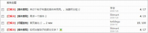 主題分類、分類信息的演示效果如下圖,其中紅色“已解決”、“已答復(fù)”是主題分類,“插件索取”、“問題求助”是分類信息,下圖第二個是分類信息模型貼內(nèi)演示: