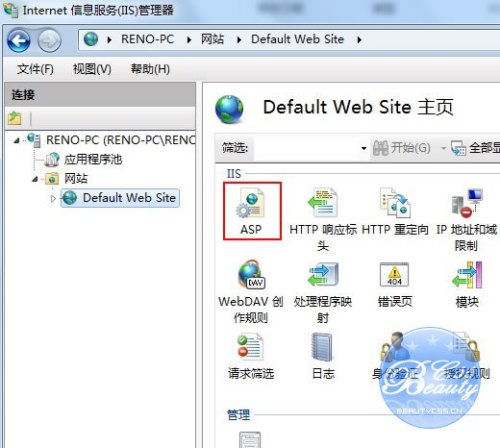 五、選擇 Default Web Site,并雙擊 ASP 的選項(xiàng)