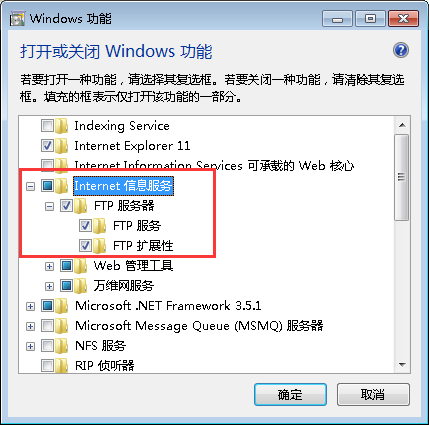 4.在“windows功能”中找到“Internet信息服務”,并選中“FTP服務”、“FTP擴展性”和“IIS管理控制臺”前的復選框,點擊“確定”。