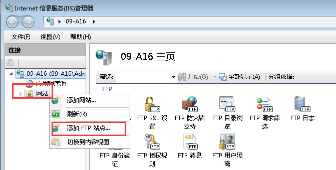 6.打開“IIS管理器”后,在左欄的“網站”上點擊右鍵,打開“添加FTP站點”。